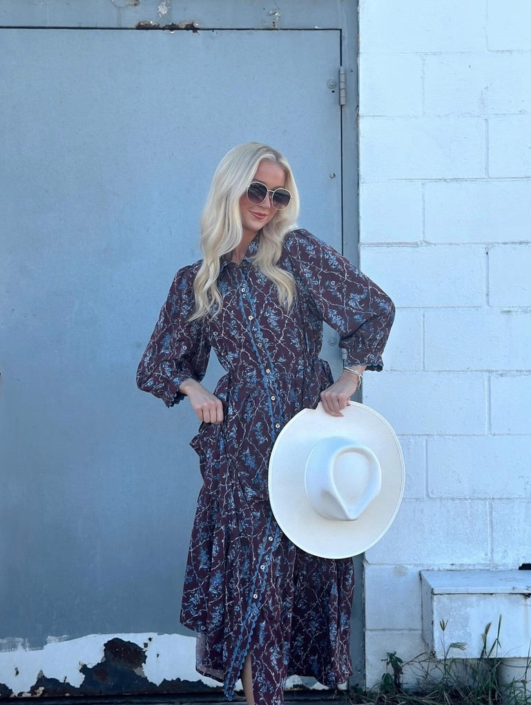 The Hattie Maxi dress combines timeless elegance with modern flair. This long maxi features a rich brown fabric accented with a striking blue design, creating a sophisticated look perfect for any occasion. The flowing silhouette offers comfort and grace, whether you're dressing up or keeping it casual. A versatile piece that works year-round.