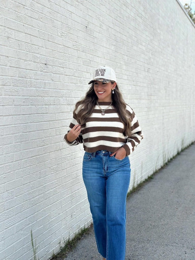 This playful sweater top combines cozy brown and cream hues with a flattering moderate cropped length, perfect for showing off a little flair while keeping comfy. Its soft knit and stylish color blocking make it an easy favorite for layering or wearing solo with your go-to jeans or skirts.