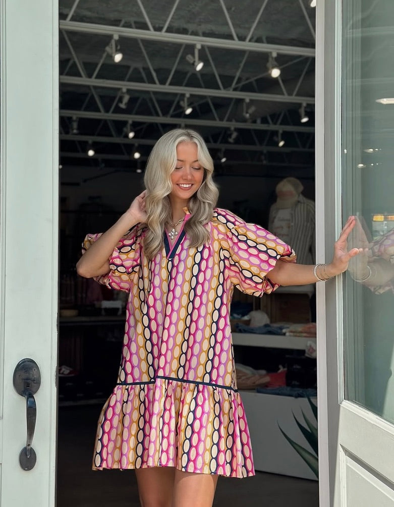 The Ariel dress brings vibrant color and effortless style to your warm-weather wardrobe. This mini dress features bold, eye-catching hues perfect for spring and summer days. Whether you're heading to brunch, a casual outing, or a weekend getaway, this piece delivers instant personality and comfort. Pair it with sneakers for a laid-back vibe or dress it up with sandals for evening plans.