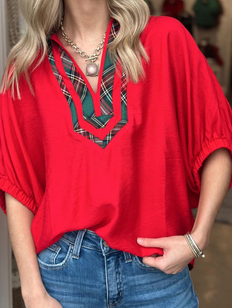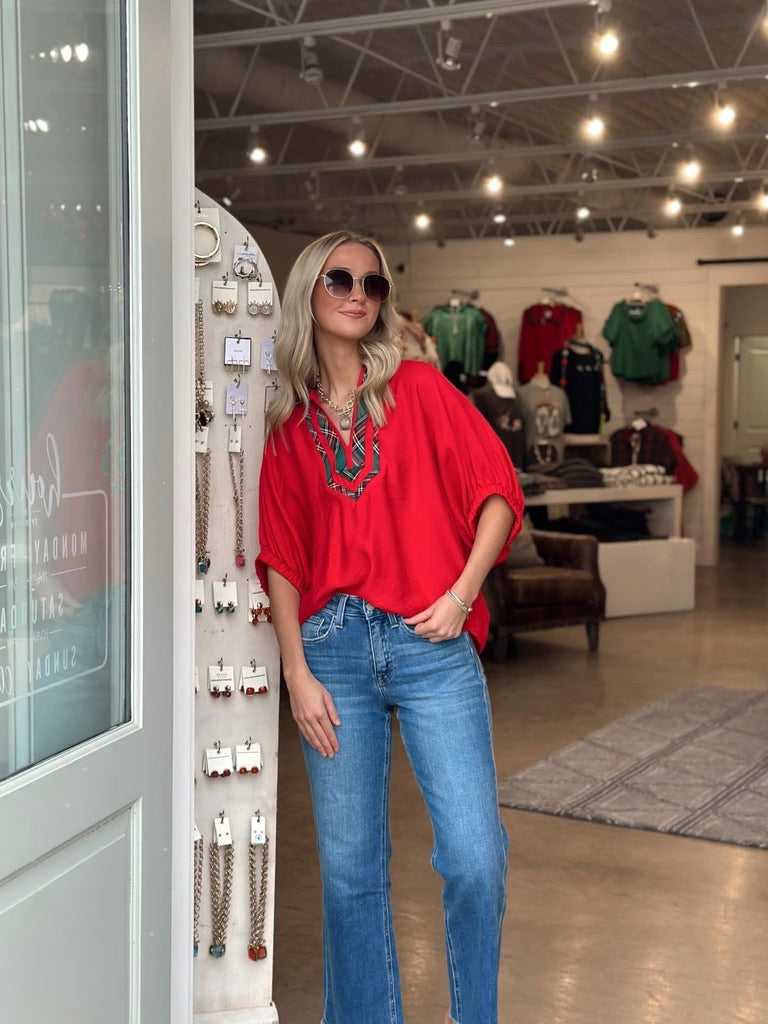 Celebrate the season in style with this festive Home for the Holidays top. Available in rich red and forest green, this wardrobe essential brings holiday cheer to your everyday look. Perfect for gatherings, casual outings, or cozy nights in, it's the versatile piece that captures the spirit of the season.