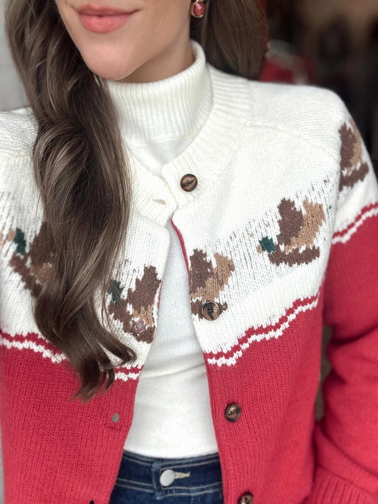 Cozy cardigan featuring a charming duck button design. Perfect for layering on cool days, this piece combines playful style with everyday comfort. Soft fabric and classic button-down construction make it a versatile wardrobe staple that works for casual outings or relaxed weekends.