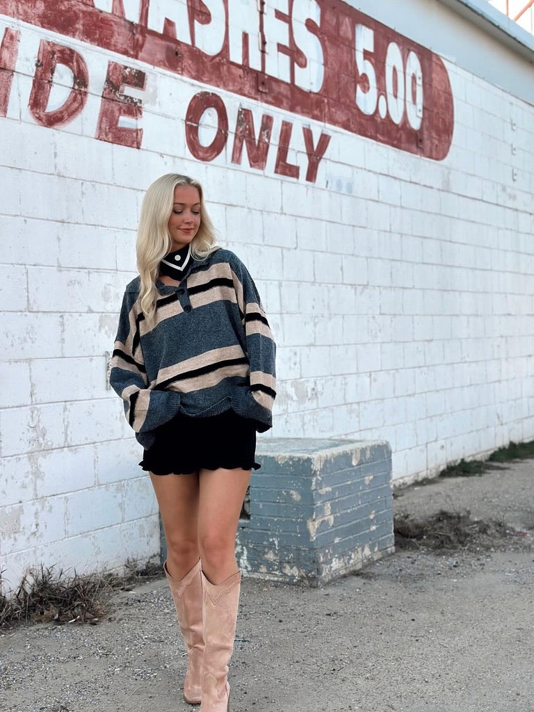 Cozy up in the Millie Striped Sweater Top, where soft charcoal meets playful brown and black stripes. This chic combo adds a fun twist to your casual look while keeping you comfy all day long. Perfect for layering or wearing solo, it’s your new go-to for effortless style with a dash of personality.
