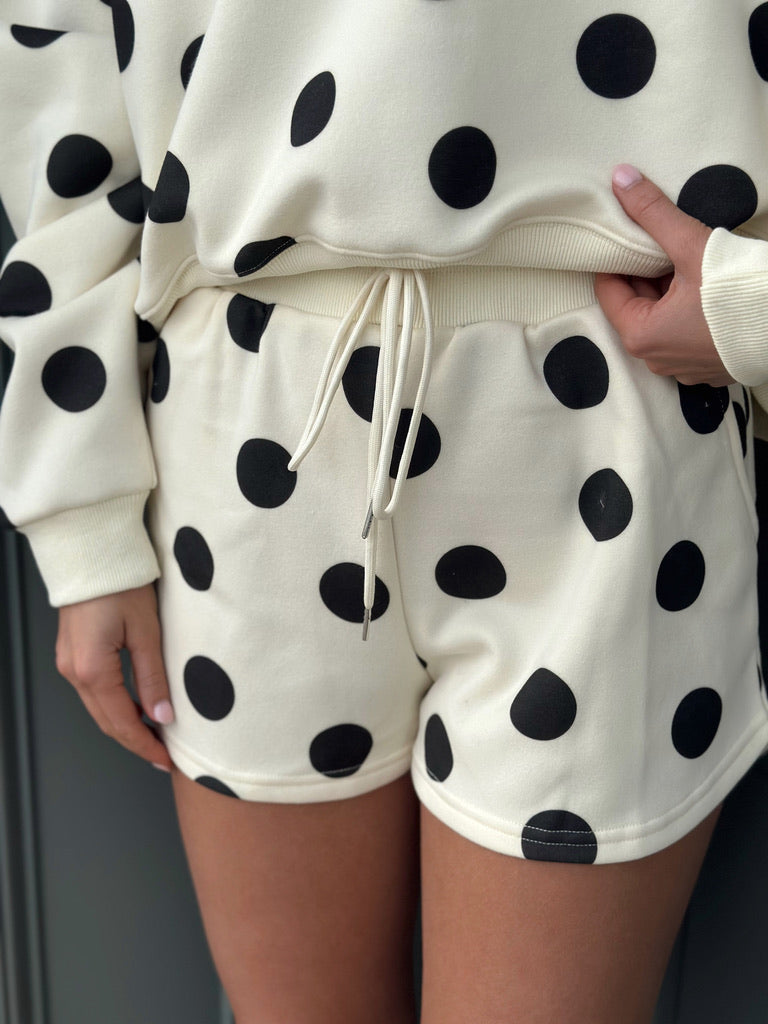 Effortless style meets playful charm with these cream shorts featuring classic black polka dots. The adjustable drawstring waist ensures a comfortable, customizable fit for all-day wear. Mix and match with our coordinating polka dot top (sold separately) to create a coordinated look that's perfect for casual outings or relaxed weekends. A versatile wardrobe essential that transitions seamlessly from day to night.