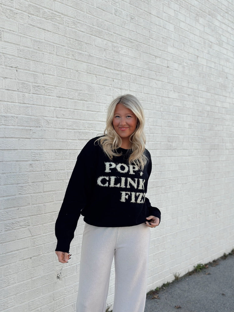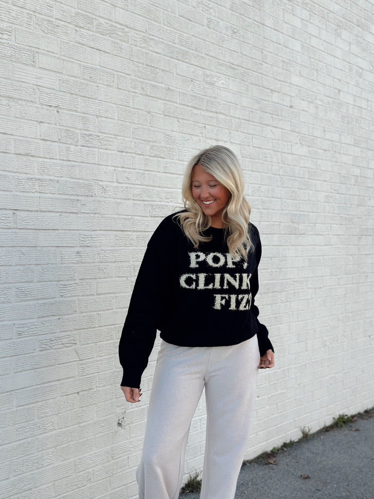 Get ready to pop, clink, and fizz in style with this playful sweater top. The shiny letters add a pop of fun to any outfit. So go ahead, add some sparkle to your wardrobe and spread the good vibes wherever you go. (And yes, you'll be the envy of everyone at brunch).