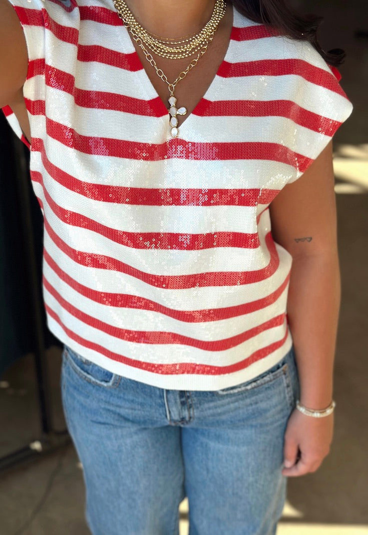 Dazzle in this eye-catching sequin top featuring bold red and white stripes. Perfect for nights out, parties, or whenever you want to shine. The shimmering sequins catch the light beautifully while the classic stripe pattern keeps it stylish and versatile. A statement piece that transforms any outfit into something unforgettable.