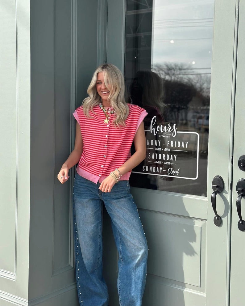 Layer effortlessly with this sleeveless cardigan top, featuring bold pink and red stripes that add visual interest to any outfit. The classic button-down design offers versatile styling—wear it open over a tee or dress it up buttoned for a polished look. Perfect for transitional weather or as a lightweight layering piece year-round.